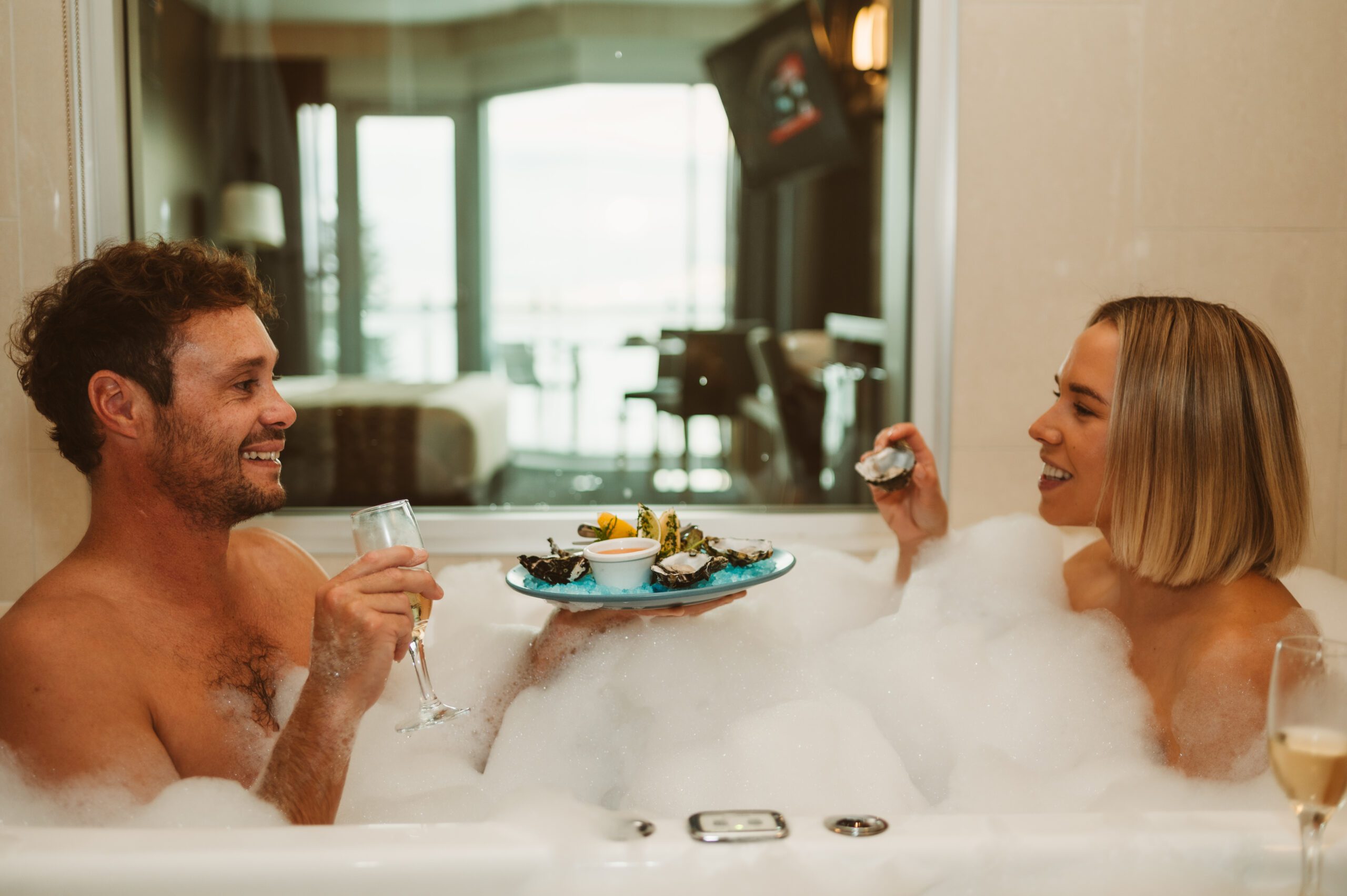 The Spa Suite is perfect for those special occasions or romantic retreats. Take in the view of the bay right from the luxurious spa bath or enjoy a relaxing glass of wine on the balcony. This modern and stylish room includes all of the amenities of the Executive Rooms and includes a king bed, dining setting for two (inside and on the balcony) writing desk, and ocean view.